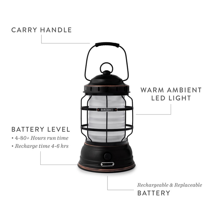 Inspired by vintage camp lights, the Barebones Forest Lantern brings warm, atmospheric illumination wherever you need it. Designed for ease and reliability, it features a simple push-button on/off function, a rechargeable battery, and a convenient micro-USB charging port. The durable build and classic silhouette make it as beautiful on a shelf as it is practical on the trail.